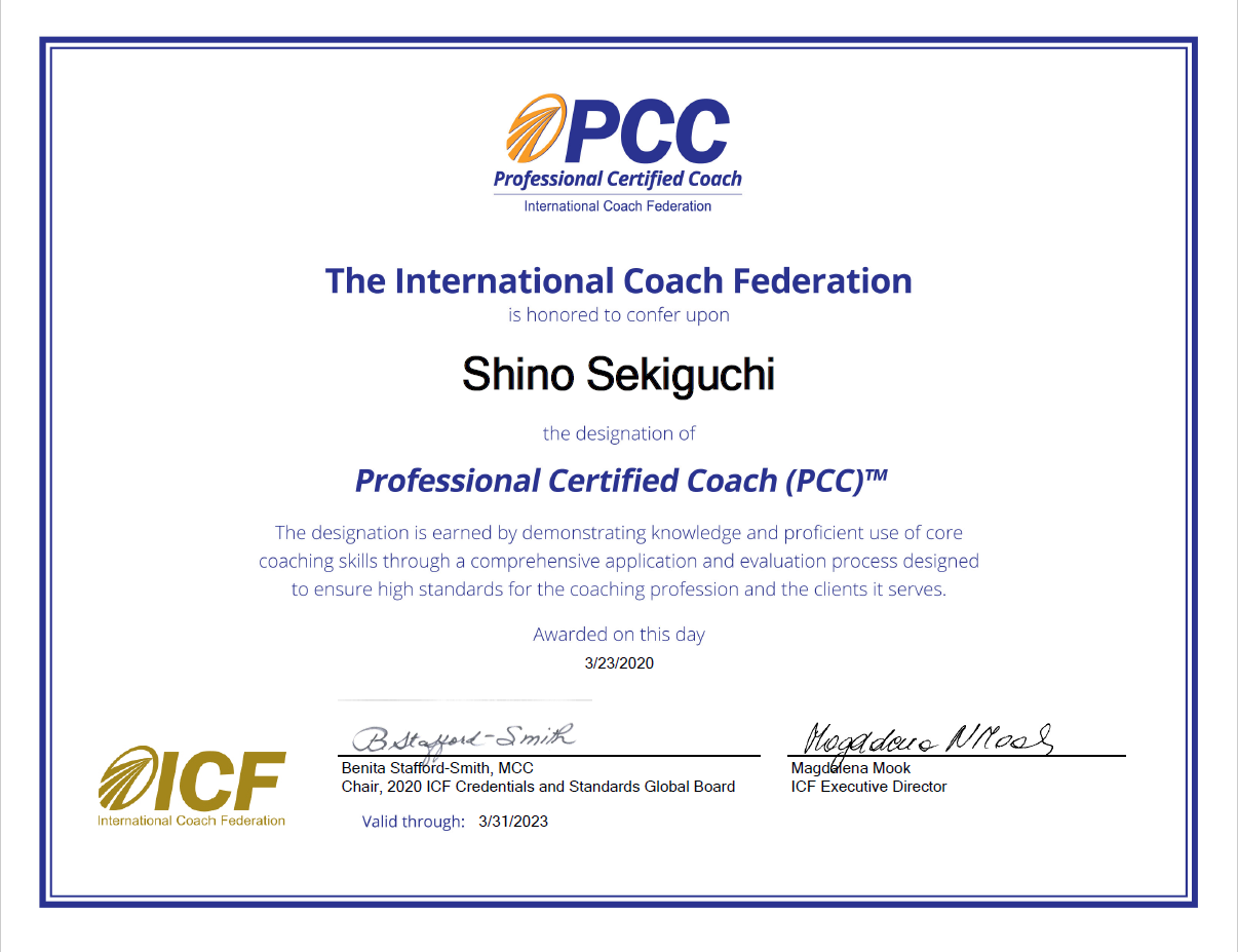 この度、ICF(International Coaching Federation, 国際コーチング連盟)のコーチ認定資格である、PCC(Pofessional Certified Coach)を取得いたしました。